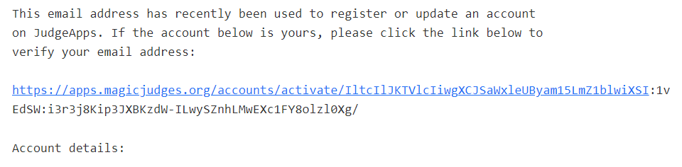 I’ve just registered my JudgeApps account, and the verification email cut off the link at the colon in it. The full text was there so I could copy and paste it. Unsure if this is consistent as I did not try to reproduce.